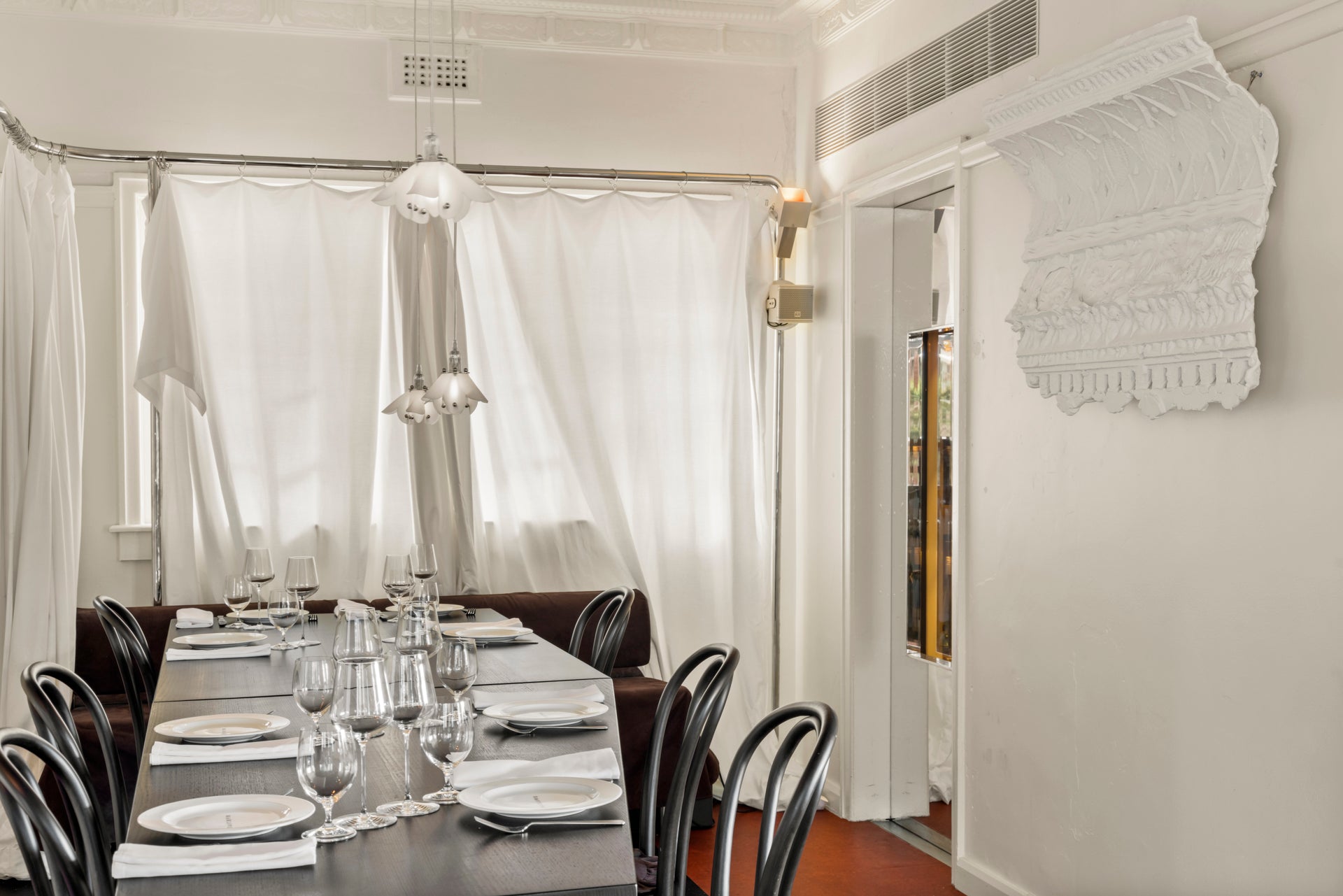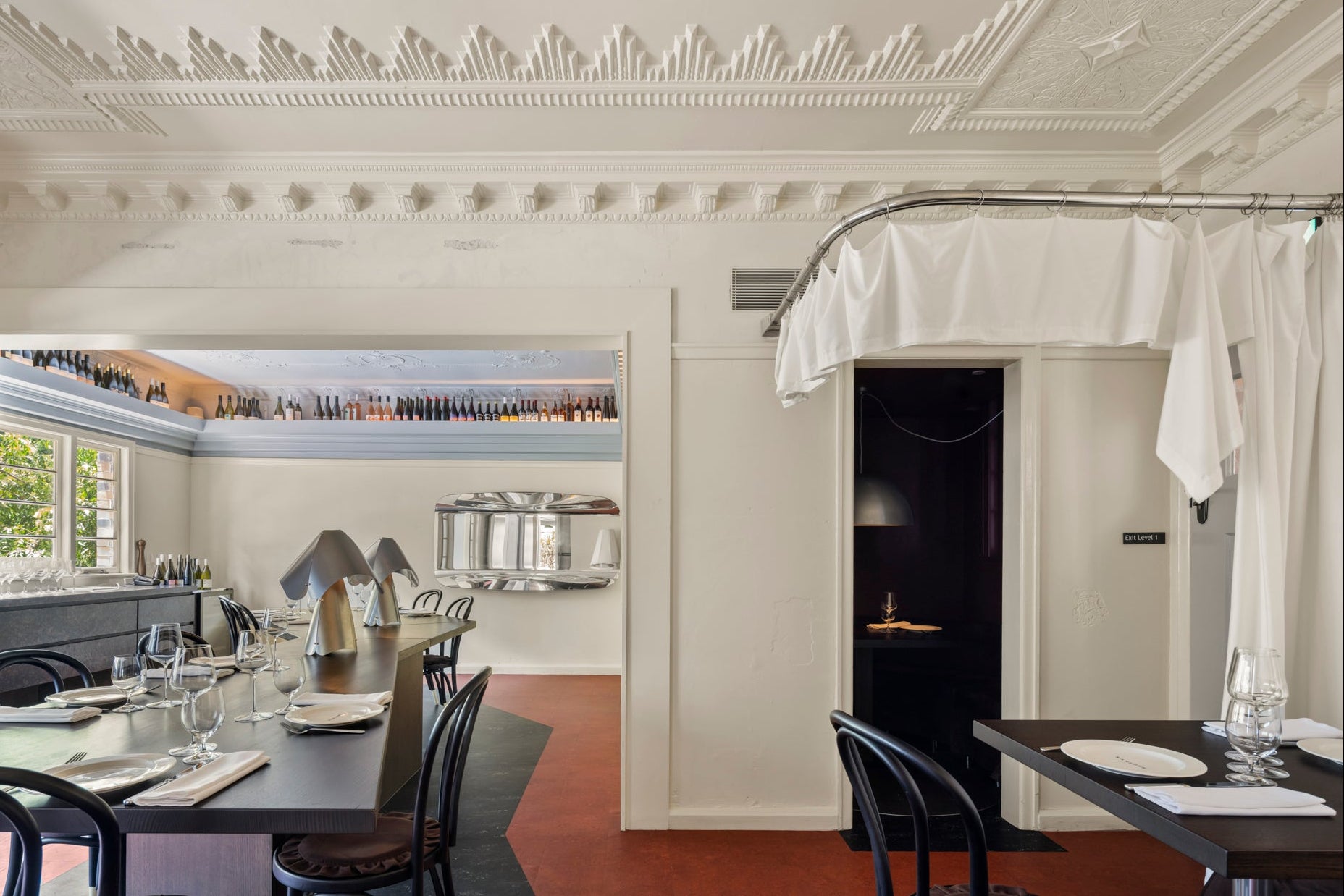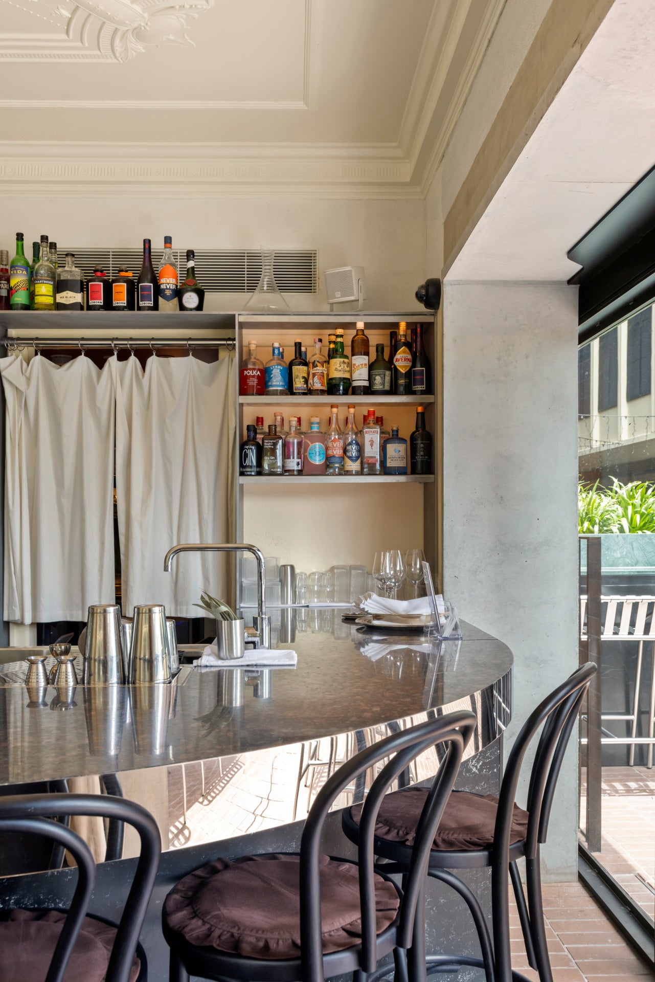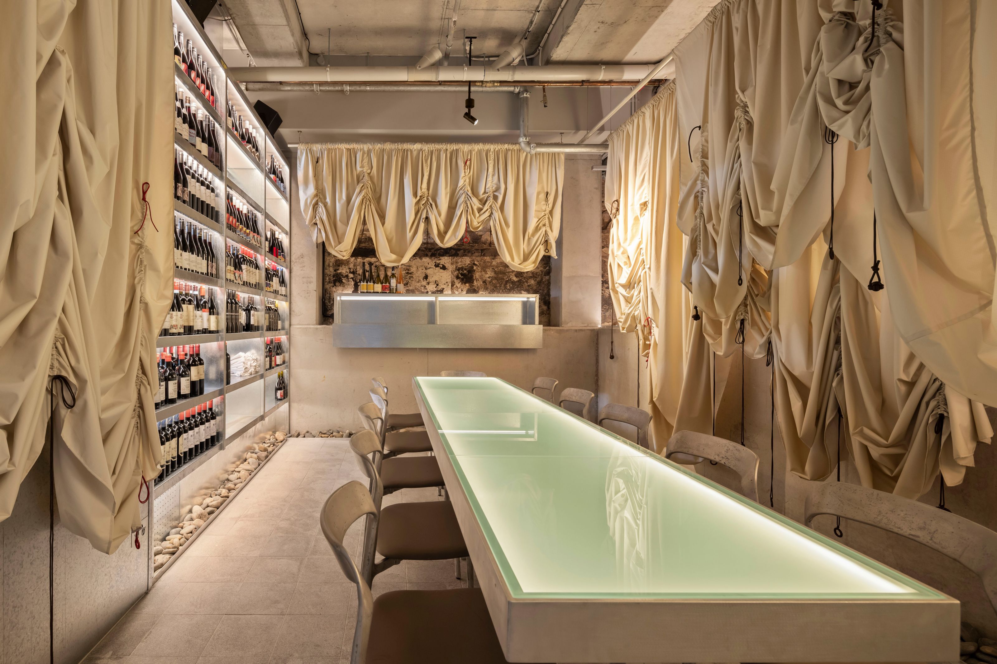 80 metres of 100% cotton sateen, fabricated into bistro curtains suspended by o-rings.Designed by Esther Pearce and Jared Webb of J.AR Office