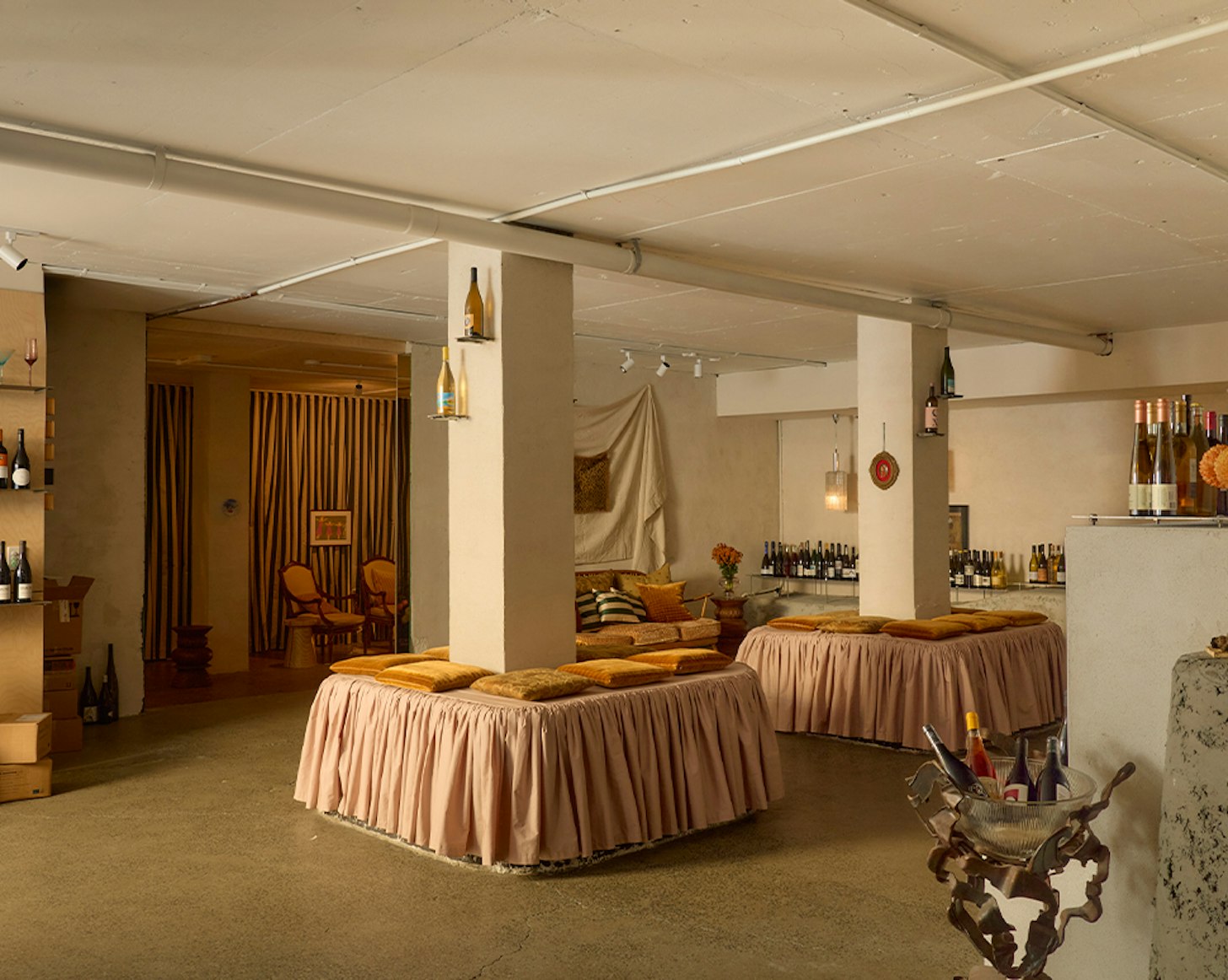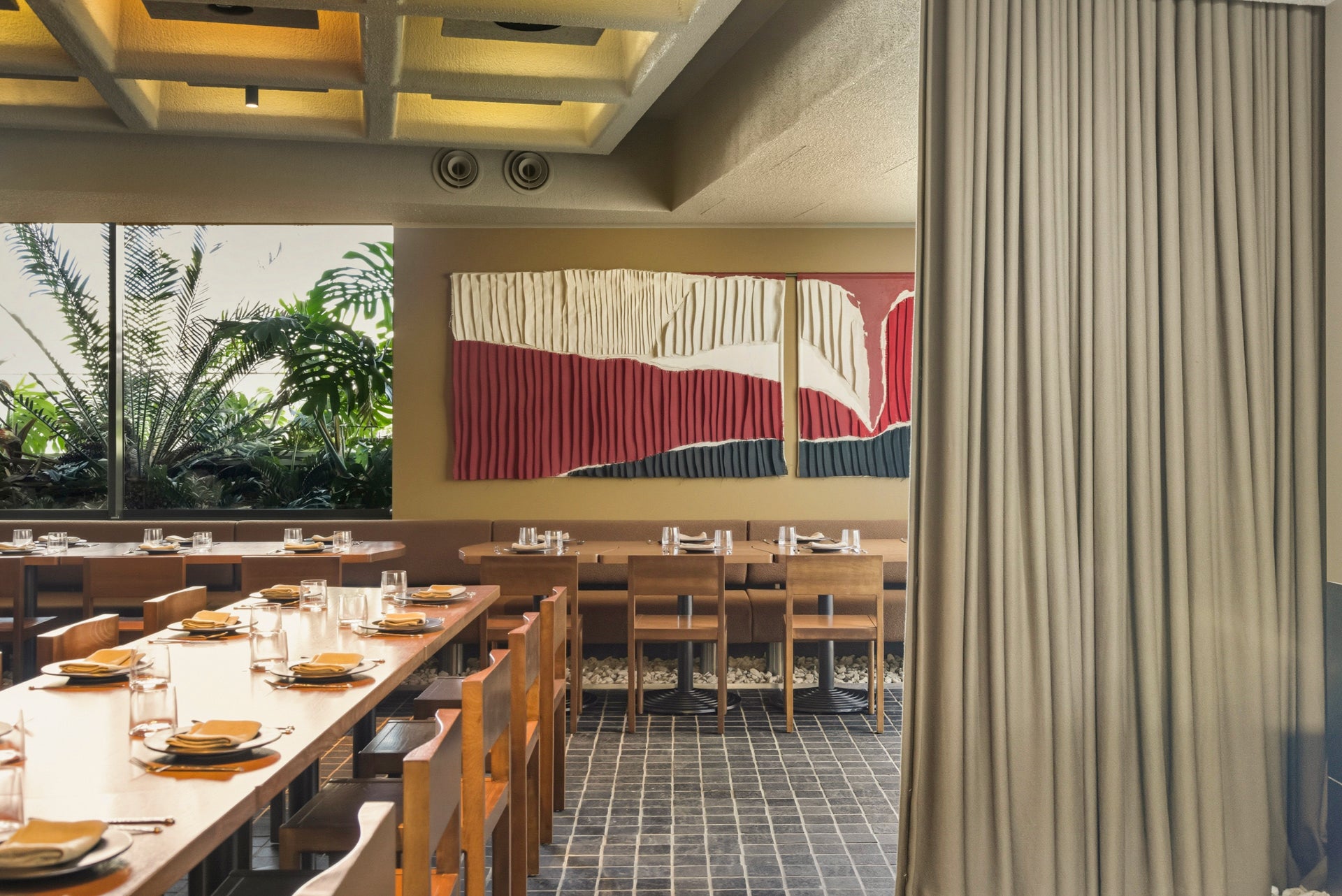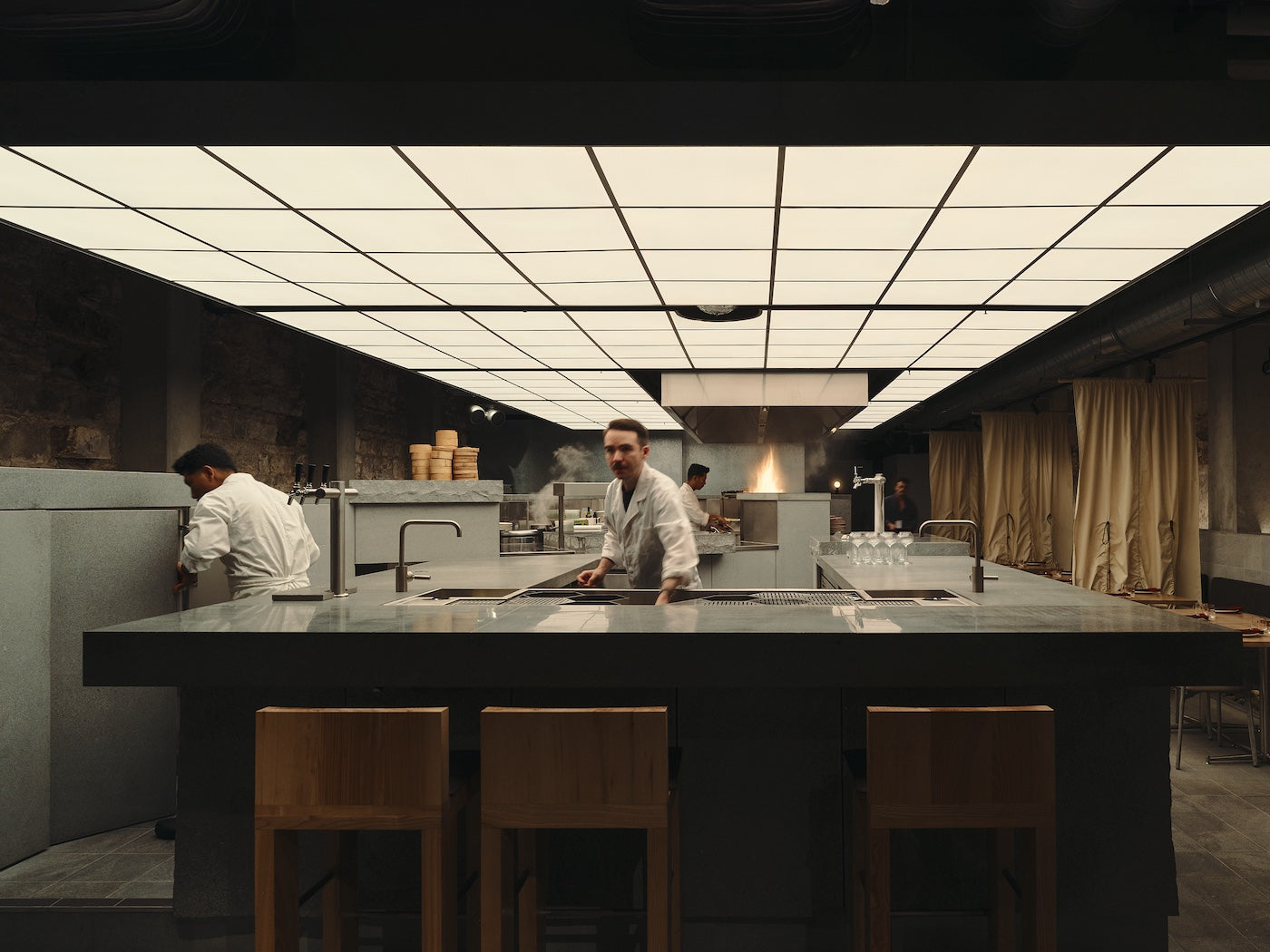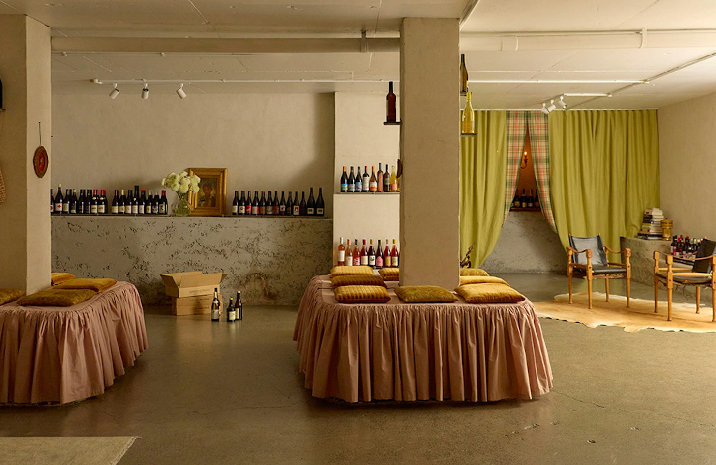 80 metres of 100% cotton sateen, fabricated into bistro curtains suspended by o-rings.Designed by Esther Pearce and Jared Webb of J.AR Office