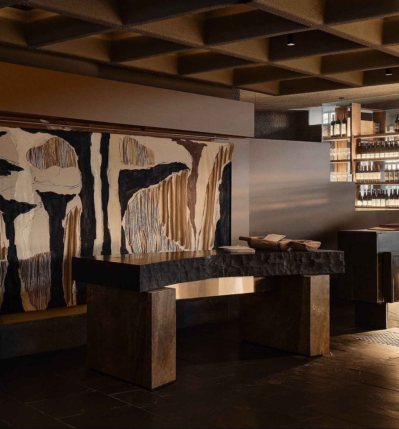 Pleated linen, charcoal, acrylic paint and sand on unprimed canvas.Designed independently with direction from Peter Reilly and Jared Webb of J.AR Office
