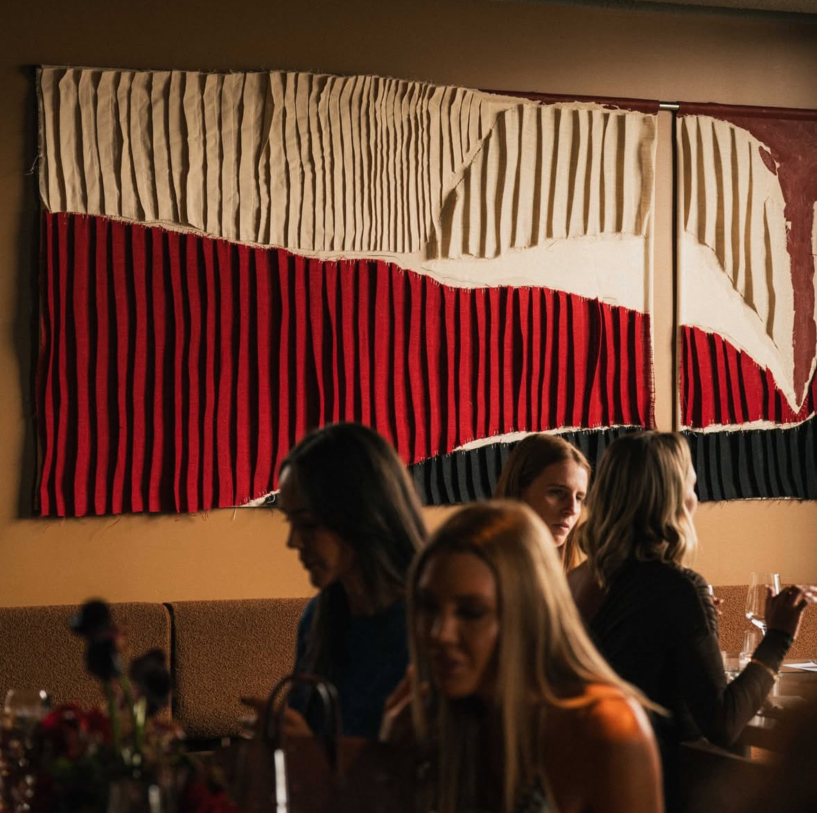 180 metres of nylon ripstop fabricated into ruched, draping wall hangings.Designed with Esther Pearce and Jared Webb of J.AR Office, installed by Lowry Group.
