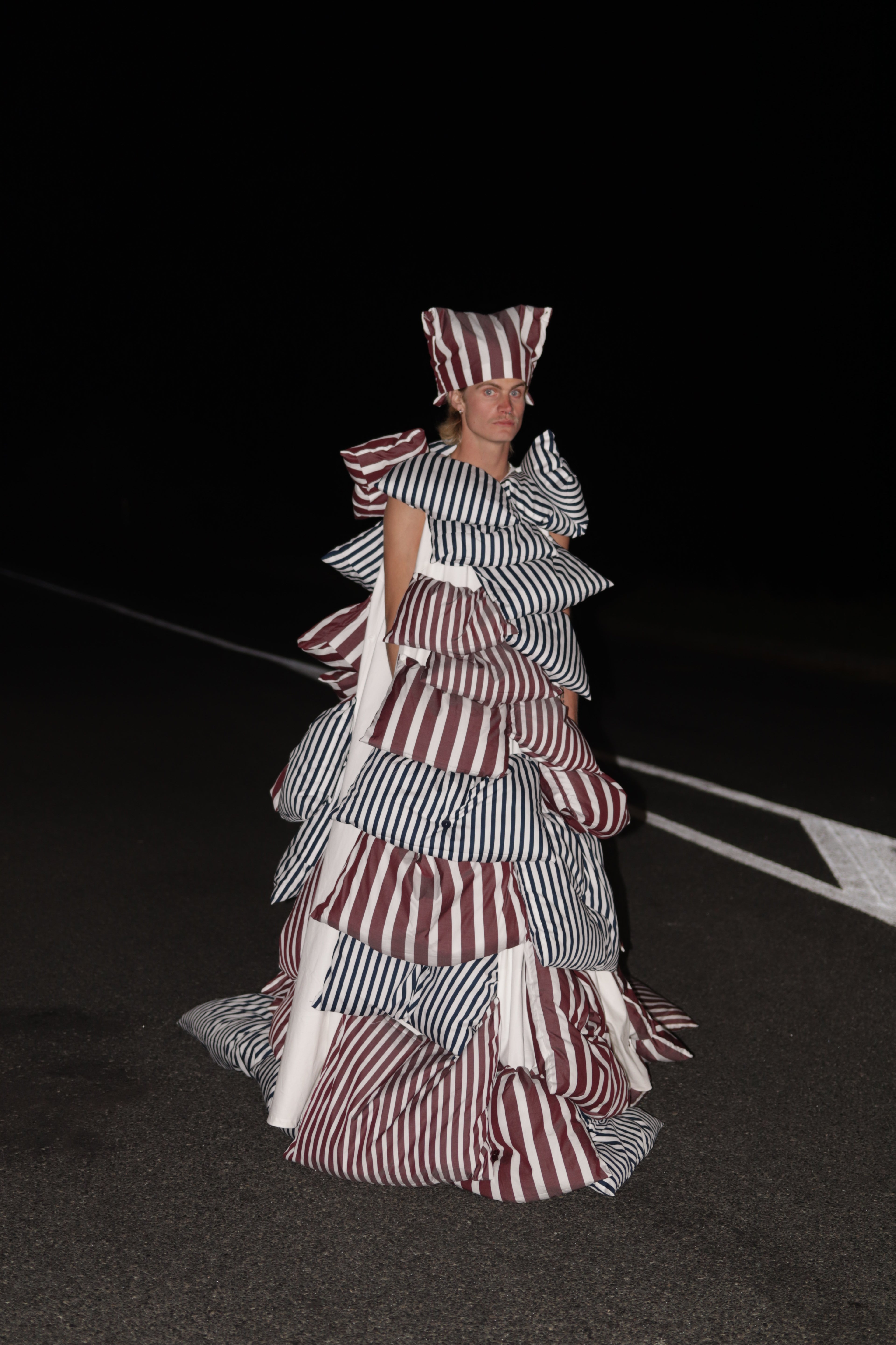 Summer dresses, coquettish-looking miniskirts matched with striped tops overlayed with bikini tops in the same fabrics indicated a whimsical design aesthetic that both Pōneke-based Emma Muir of Rhoda Nunn and Ōtepoti/Meaanjin-based designer George Oliver Park have both developed - and on this occasion, expertly complemented on another in a seamless showcase.